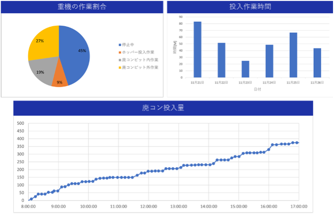 重機やピットに設置したセンサにより作業状況を数値化して分析しました。具体的には、主要業務(ホッパーによる廃棄物の投入)と間接業務(粉砕や積替え)の割合、廃棄物を荷下ろししてから再資源化処理するまでの作業推移と廃棄物の一次処理にかかる時間を可視化しました。これらにより、現場の目視でしか把握できなかった作業状況を定量化でき、1時間における廃棄物の投入量・投入平均回数や粉砕時間などを把握することで、作業効率の改善施策の検討に繋がりました。