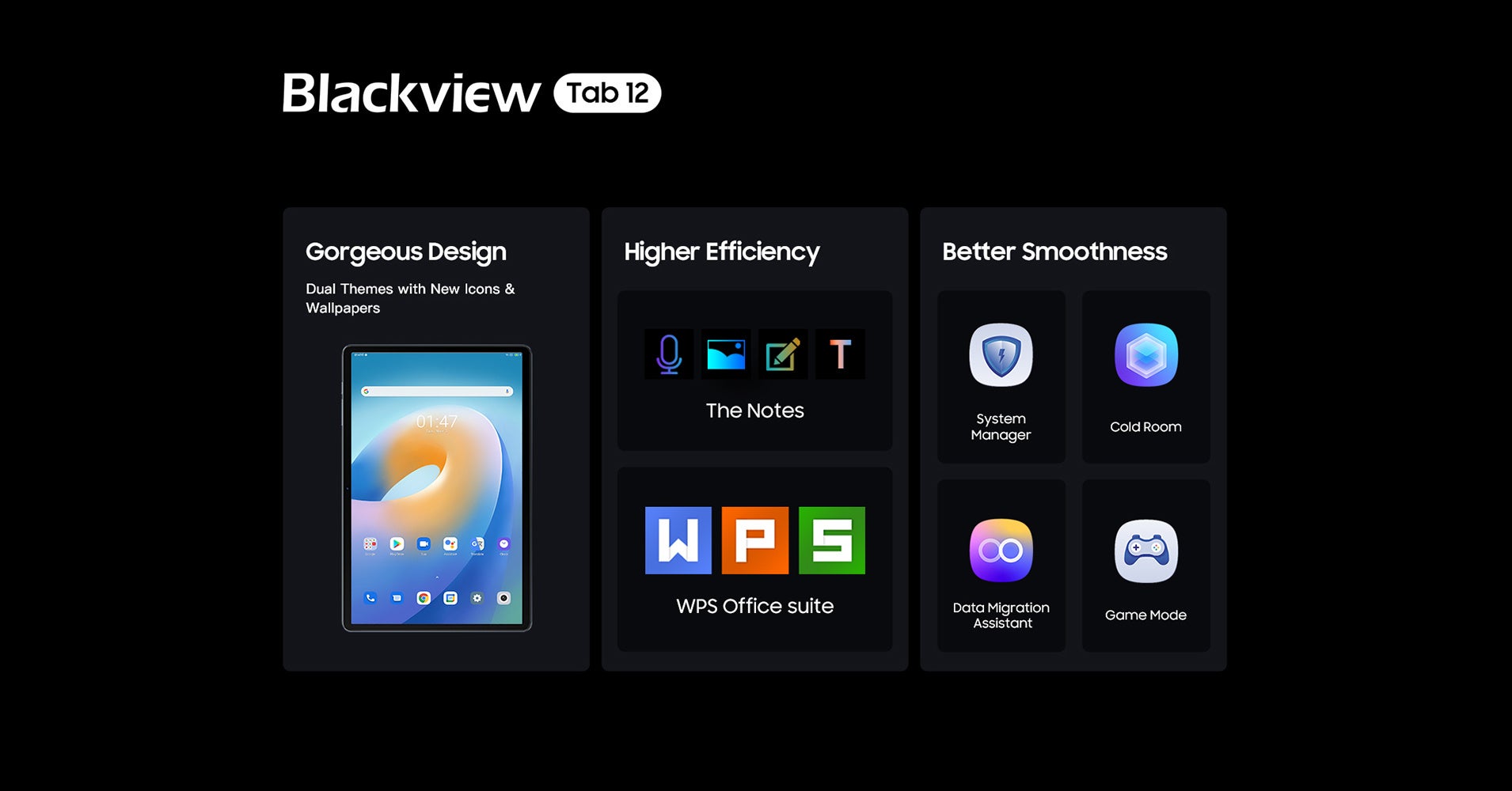 また、サラリーマンや学生にとって喜ばしいことに、Tab 12にはWPSオフィスセットやメモを残せるアプリとして『Notebook』が導入されています。これにより、ユーザーはWordファイル、Excelシート、パワーポイントをすべて1つのアプリで開くことができ、作業効率が向上します。『Notebook』はオーディオ、テキスト、画像、さらにはメモの挿入をサポートしており、学習効率を高めることも出来るでしょう。