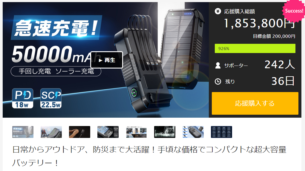 V18超大容量バッテリーとは日常利用だけでなく、災害やアウトドアでも使える最新版の超大容量バッテリーです。Makuakeでのプロジェクト開始から1時間で応援総額150万円を突破、すでに242名を超える皆様よりご支援いただいております。