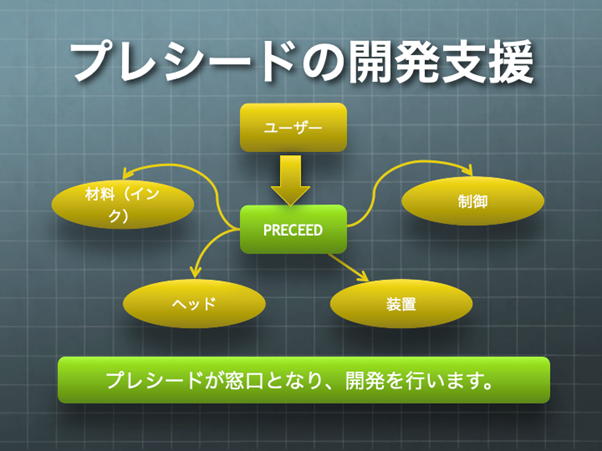 株式会社プレシードは、産業用インクジェットの導入によって、自社開発リードタイムの短縮や在庫のミニマム化、材料ロスの削減(環境負荷改善)などを実現したいお客様に最適なソリューションをご提案いたします。