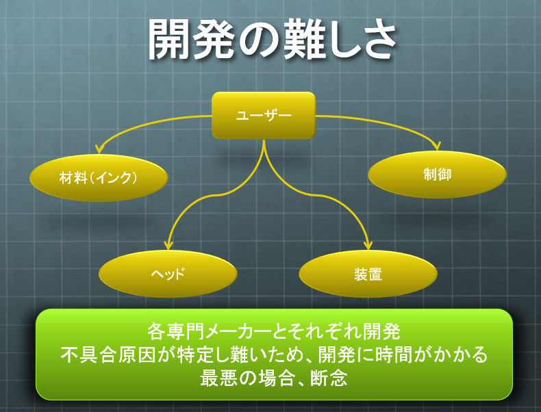当社が窓口となり、インクやヘッド、装置、制御などの各専門メーカーと開発を進めることで、開発までのリードタイム短縮や開発断念へのリスクヘッジに繋がります。