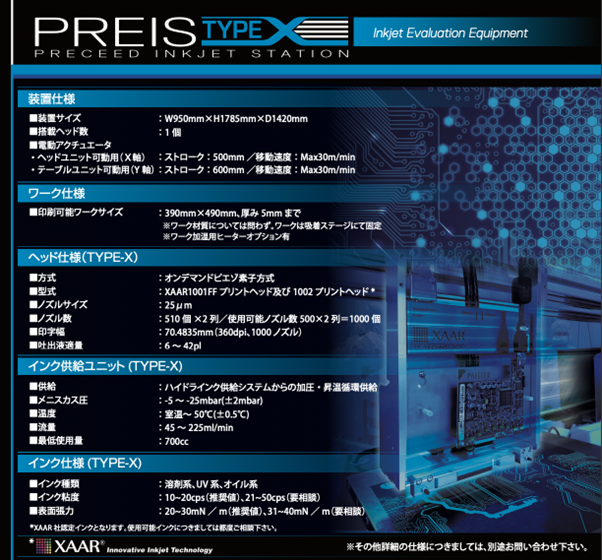■産業用インクジェット評価装置「PREIS(PRECEED INKJET STATION)」のスペック詳細