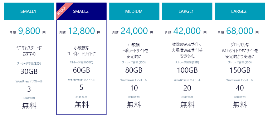 ミニマムスタートから、グローバルなWebサイトやECサイトを安定的かつ高速に運用できるプランまで、5つの幅広いラインアップを提供します。