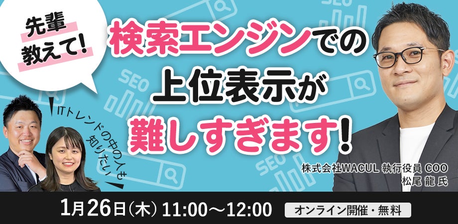 【1/26(木)Webセミナー】 「先輩教えて!検索エンジンでの上位表示が難しすぎます!」を開催