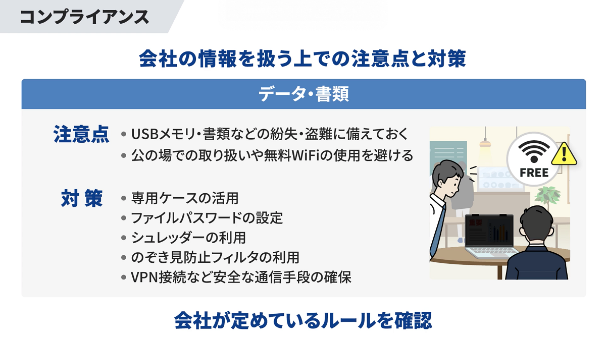②個人情報の取り扱い・SNS投稿での注意点など、近年問題になりやすいコンプライアンスについて詳しく説明しています。