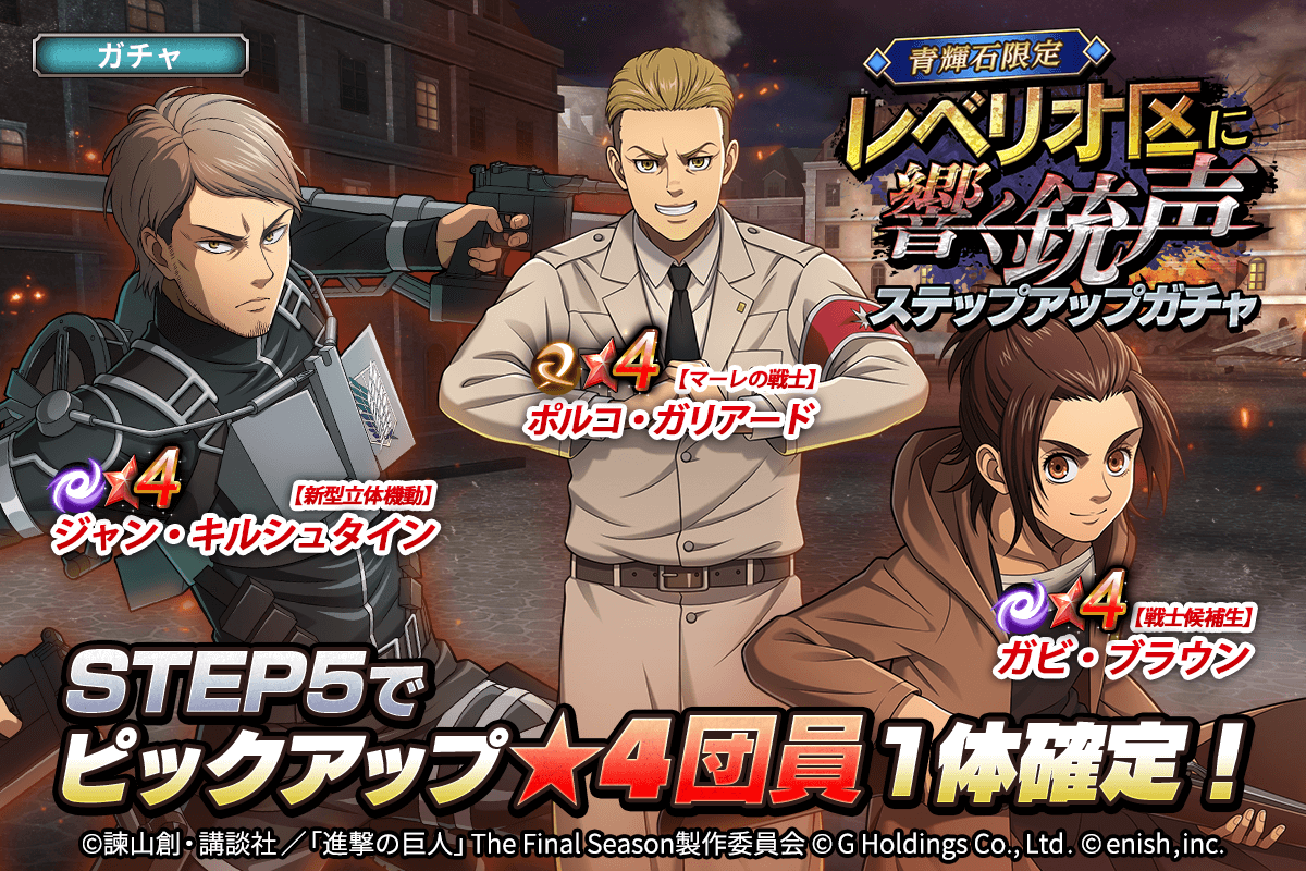 ・新登場の【新型立体機動】ジャン・キルシュタイン/【戦士候補生】ガビ・ブラウン/【マーレの戦士】ポルコ・ガリアードがピックアップされたガチャ。