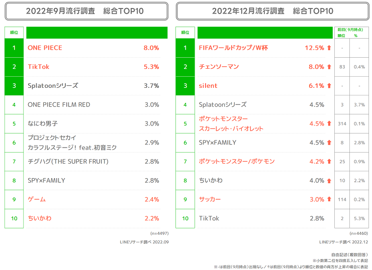 LINEでは、同社が保有する約616万人*の国内最大級のアクティブな調査パネルを基盤とした、 スマートフォン専用のリサーチプラットフォーム「LINEリサーチ」を運営しております。LINEリサーチでは、全国の15〜24歳の若年層の男女を対象に、四半期ごとに最近の流行についてアンケート調査(自由記述形式)を実施しております。2022年下半期は9月、12月の2回調査を実施しましたので、その調査結果をお知らせいたします。