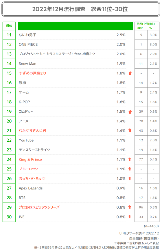 ・最新12月期の11位以降のランキングでは、「なにわ男子」や「プロジェクトセカイ カラフルステージ!feat.初音ミク」など毎回ランクインしているアイドルグループやゲームタイトルが並ぶ中、15位に「すずめの戸締まり」が急上昇でランクインした。