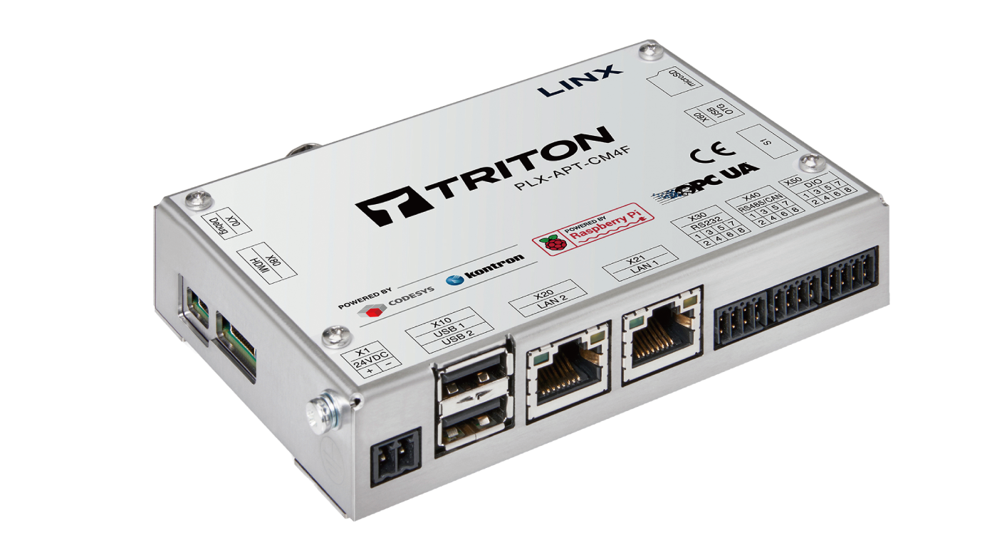 「TRITON」は、コストパフォーマンスに優れた高性能のハードウェアとチューニング済みのOSにCODESYSをパッケージしたオールインワンPLCで、強力なパフォーマンスに加えて、産業用途としての長期供給保証および、充分な保護機能を備えています。導入から装置への組み込み開発をすぐに開始することが可能です。