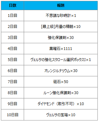 イベント期間中、10日間ログインするだけで「魔法の砂時計」や「ヴェルサの宝箱」などをプレゼント!忘れずにログインして全ての報酬をお受け取りください。