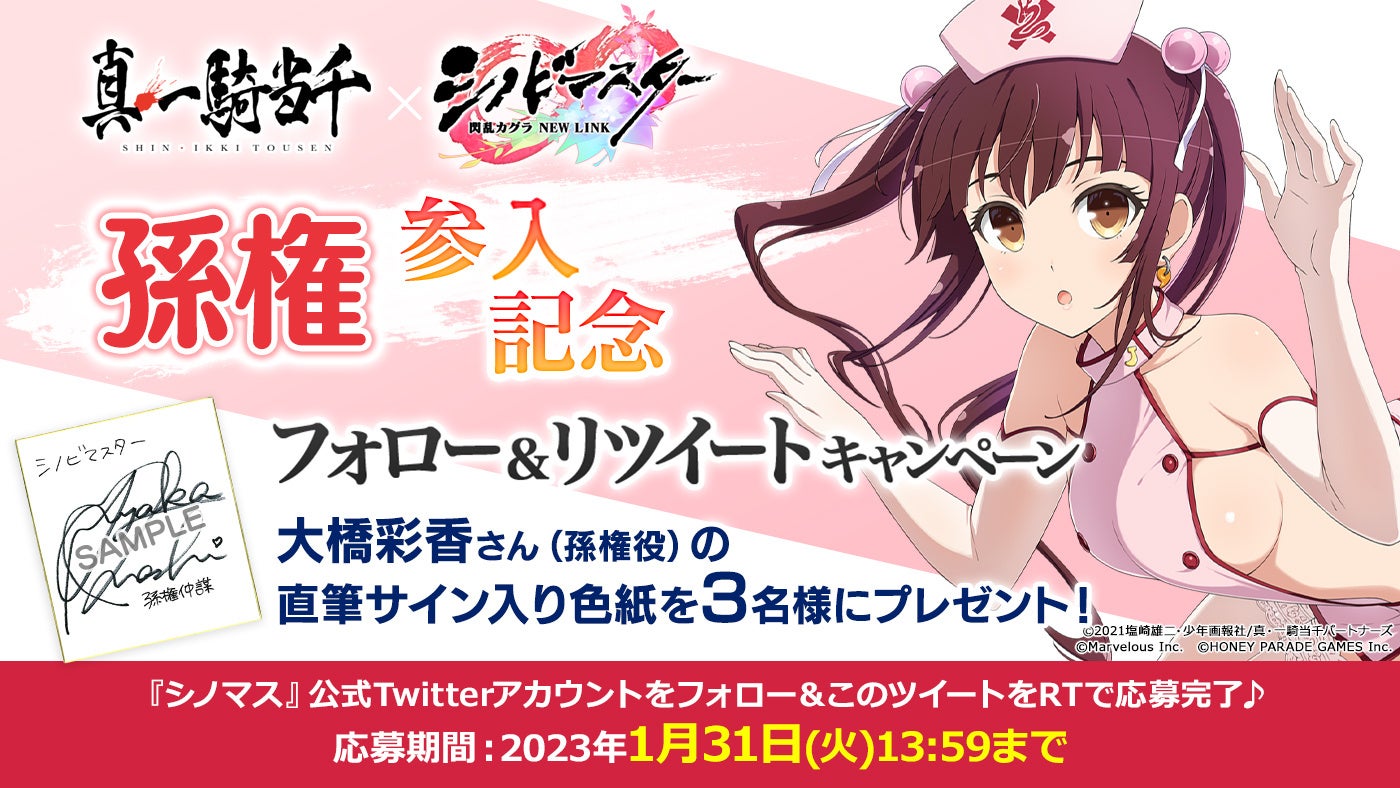 「孫権」の『シノマス』参入を記念し、大橋彩香さん(孫権役)の直筆サイン入り色紙を、3名様にプレゼント!