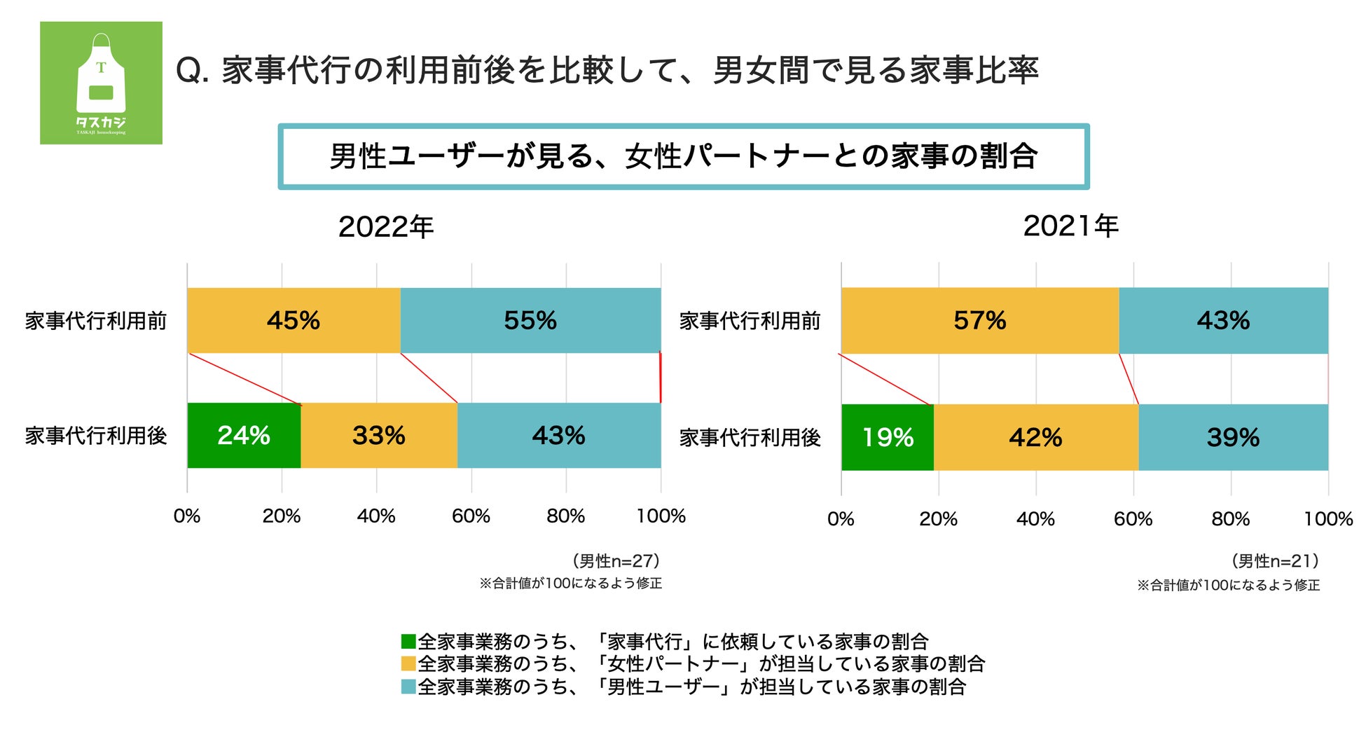 一方で男性ユーザー世帯では、家事代行利用前でも男女間の家事は折半しており(2021年実施時:女性57%・男性43%)、家事代行利用後は、家事代行に依頼する家事は24%、女性パートナー33%、男性ユーザー43%という結果でした(2021年実施時:家事代行19%・女性42%・男性39%)。2021年アンケート実施時と比較しても、家事シェアはやや進んでいる傾向でした。