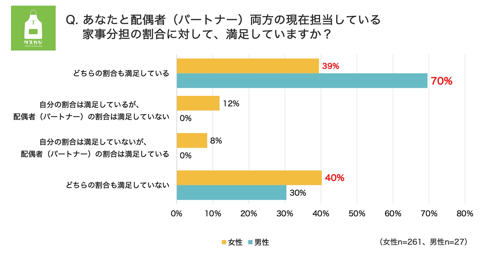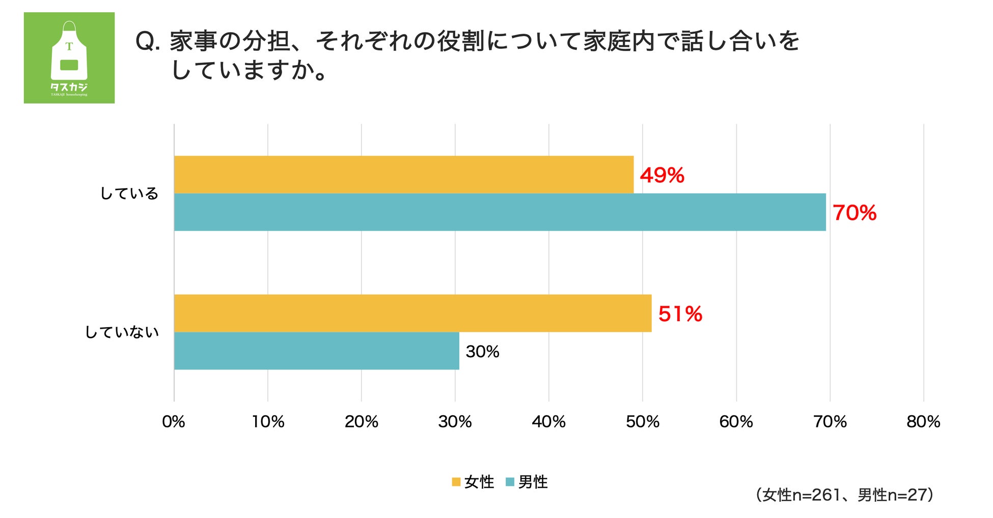 シェアリングエコノミーの家事代行マッチングプラットフォーム「タスカジ」を運営する、株式会社タスカジ(本社:東京都港区、代表取締役:和田幸子、以下タスカジ)は、『家庭内の家事シェア実態調査』を発表いたしました。