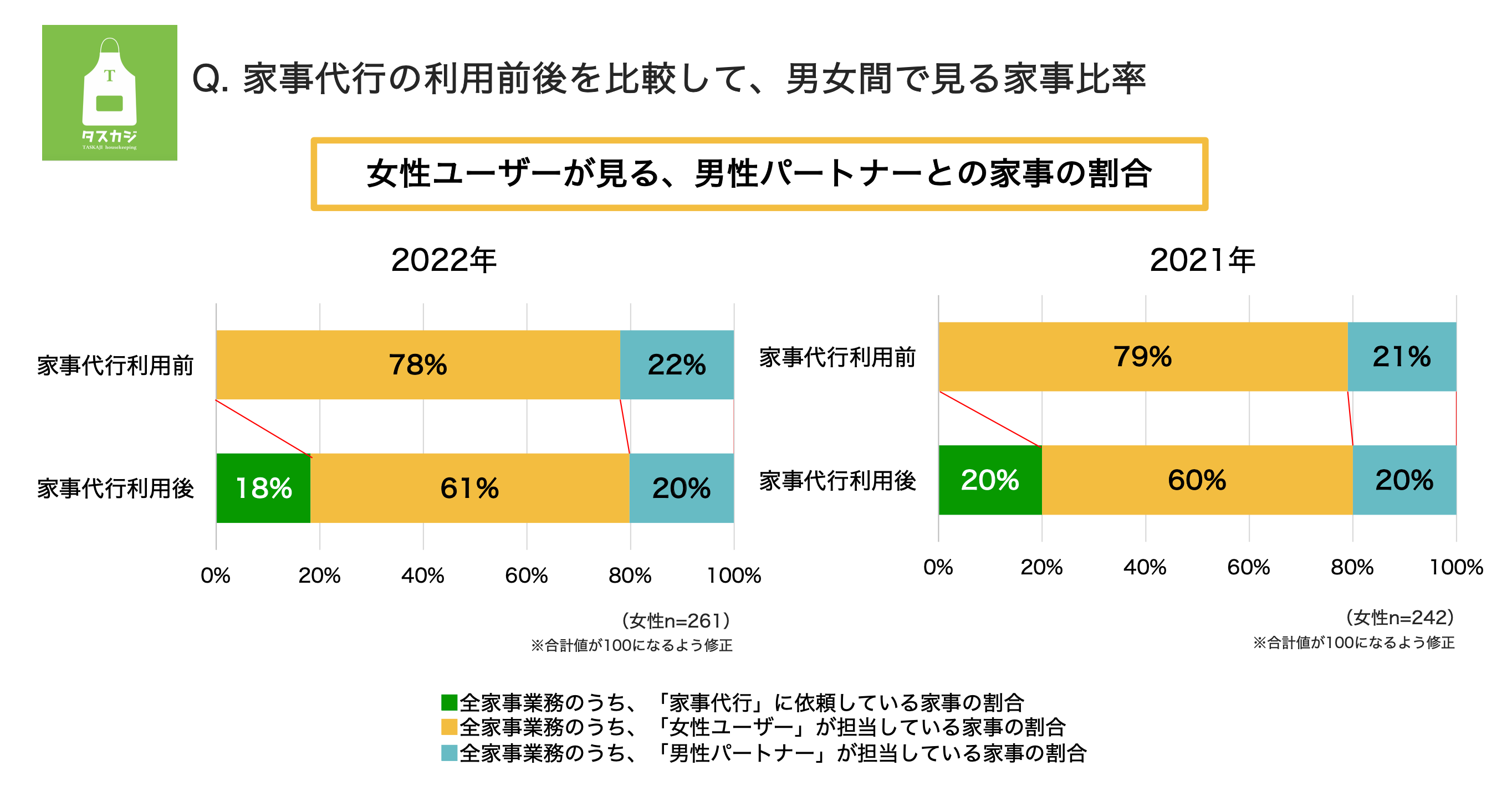 ・女性ユーザー世帯では、家事代行利用前は女性ユーザー78%・男性パートナー22%と圧倒的に女性の家事比率が高く(2021年実施時:女性79%・男性21%)、家事代行利用後は、家事代行に依頼する家事は18%、女性ユーザー61%、男性パートナー20%だった(2021年実施時:家事代行20%・女性60%・男性20%)。2021年アンケート時と同様の傾向だった。