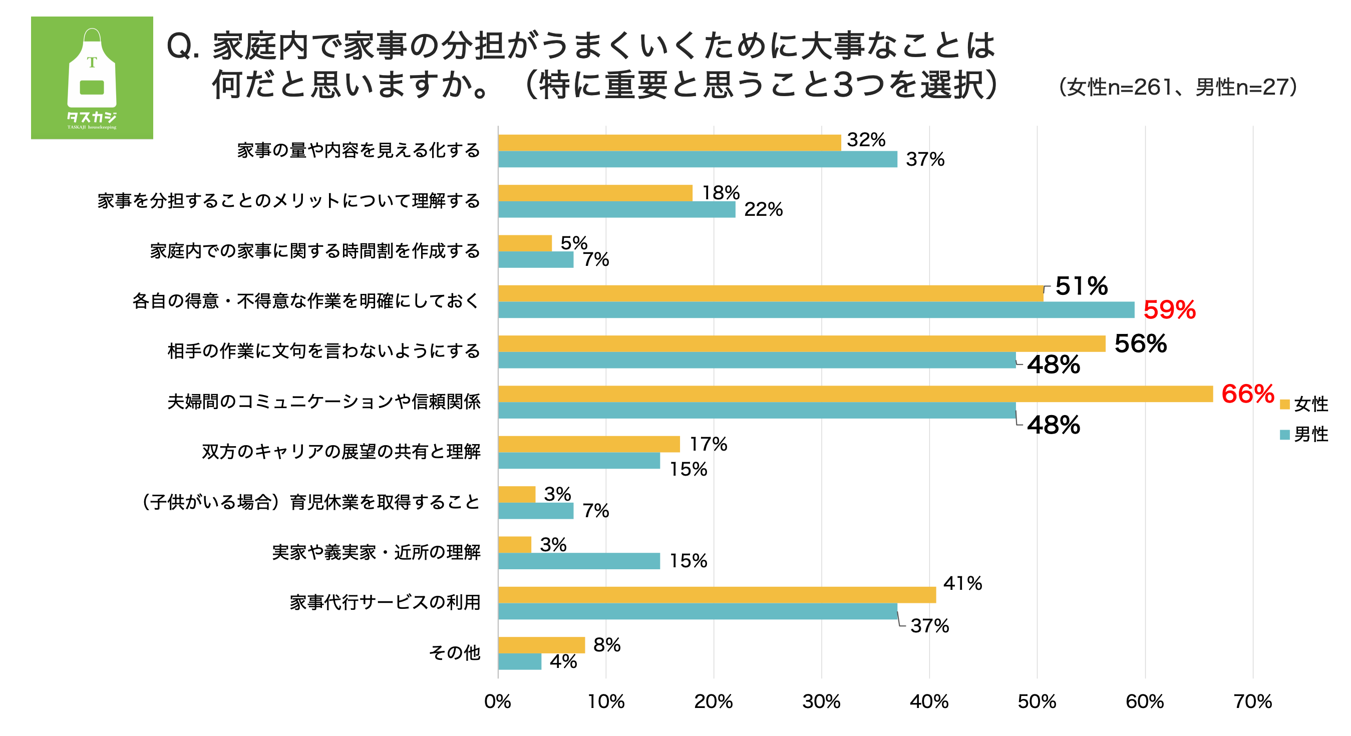 女性は「コミュニケーション・信頼関係」といった比較的情緒的な回答が一番多かったのに対し、男性は「得意・不得意作業の明確化」が一番多く、大事だと思っていることは男性の方がより具体的な傾向でした。