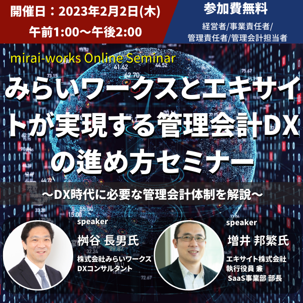 | タイトル | みらいワークスとエキサイトが実現する管理会計DXの進め方セミナー ~DX時代に必要な管理会計体制を解説~ |