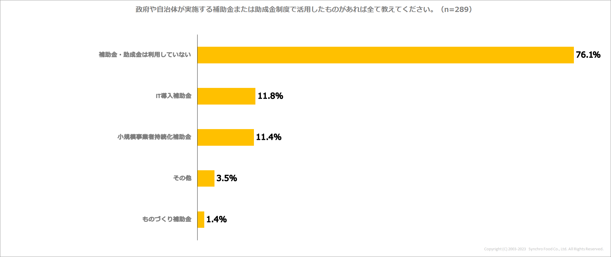 また、デジタルツール導入における補助金または助成金制度の活用実態を尋ねたところ、76.1%もの店舗が「補助金・助成金は利用していない」と回答。デジタルツールを導入する際に、政府や自治体が実施する補助金・助成金制度を活用した人は、約2割にとどまりました。具体的な利用状況を見ると、「IT導入補助金(11.8%)」と「小規模事業者持続化補助金(11.4%)」の利用が目立つ結果となりました。