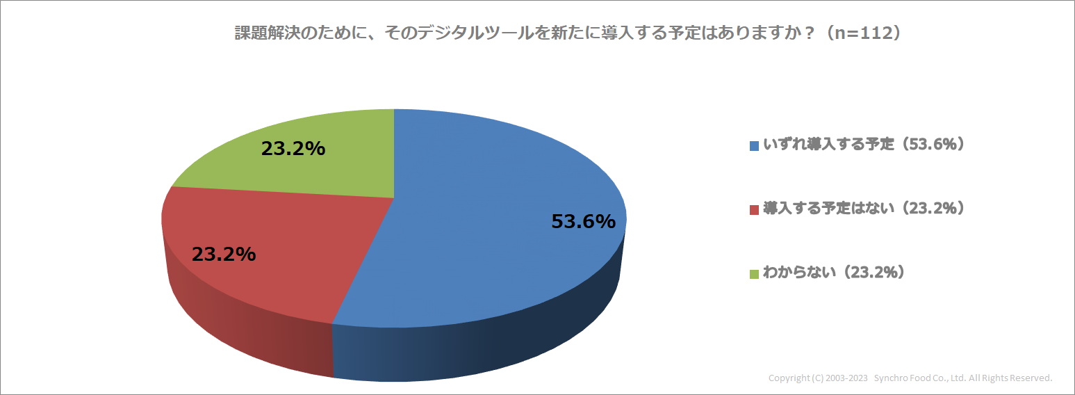 また、「解決できると思う」、「部分的に解決できると思う」と回答した方に、課題解決のために、そのデジタルツールを新たに導入する予定があるか尋ねたところ、「いずれ導入する予定(53.6%)」と回答した店舗が半数を超えました。一方で、「導入する予定はない(23.2%)」と導入に消極的な店舗も一定数います。
