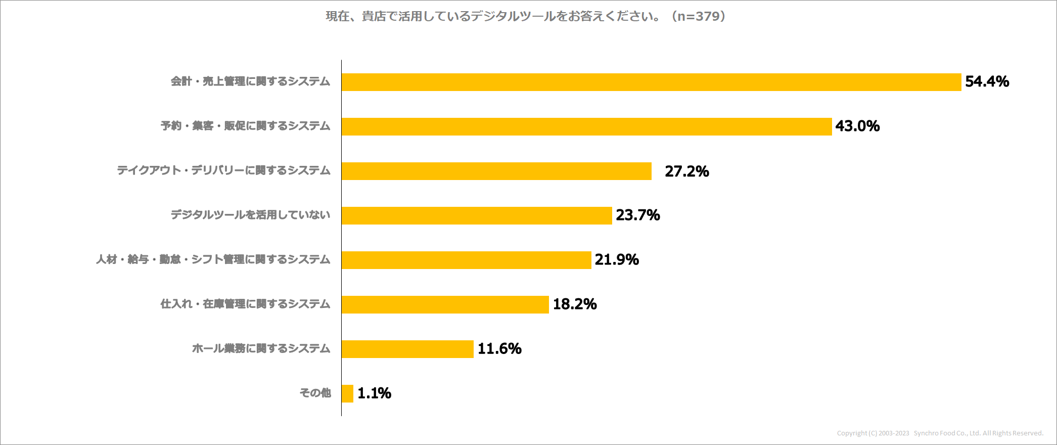 まず、自店舗で活用しているデジタルツールについて尋ねたところ、76.3%の店舗で「何らかのデジタルツールを活用している」(デジタルツールを活用していない=23.7%)ことが明らかとなりました。複数のデジタルツールを導入している店舗も多く、飲食店のIT化が浸透しつつあると言えます。デジタルツールの種類を見ると、最も多かったのは「会計・売上管理に関するシステム(※1)」との回答で、54.4%。次いで、「予約・集客・販促に関するシステム(※2)(43.0%)」、「テイクアウト・デリバリーに関するシステム(27.2%)」と続きます。