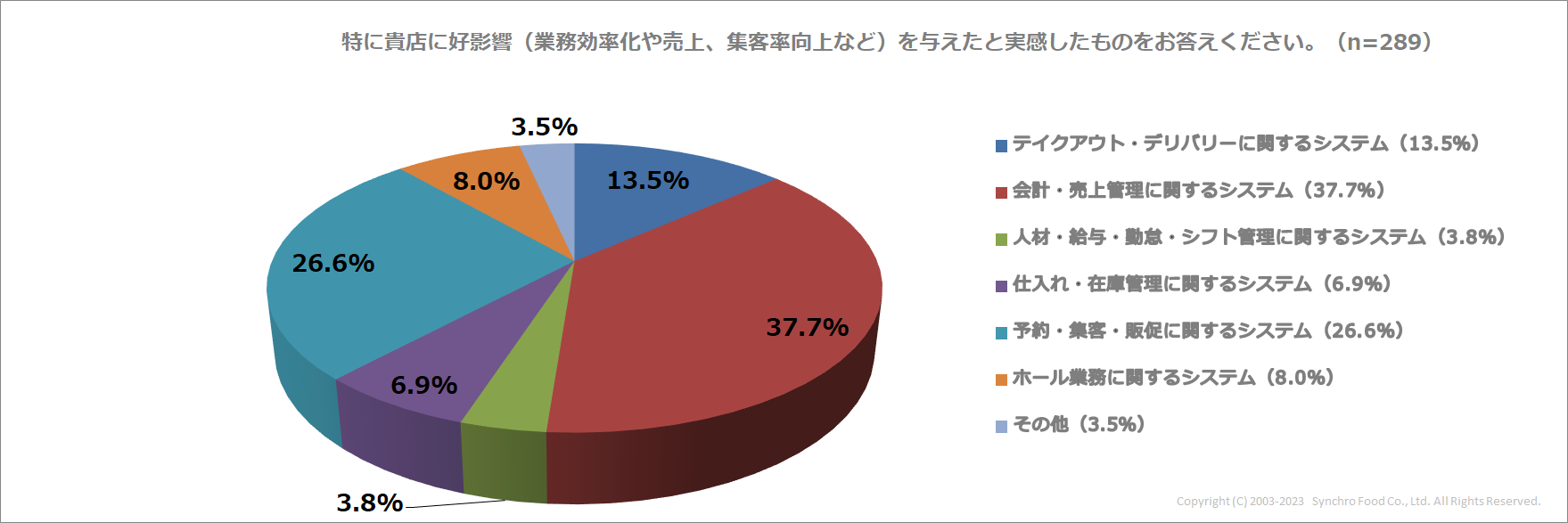 続いて、自店舗で活用したデジタルツールの中から、特に好影響(業務効率化や売上、集客率向上など)を実感できたものを答えてもらいました。最多は、「会計・売上管理に関するシステム(37.7%)」との回答。これに「予約・集客・販促に関するシステム(26.6%)」、「テイクアウト・デリバリーに関するシステム(13.5%)」が続く結果となりました。また、「ホール業務に関するシステム(※3)」を活用しているのは44人と限られるものの、約半数にあたる23人が特に好影響を実感したと回答。活用した上での満足度が比較的高いシステムであると言えます。