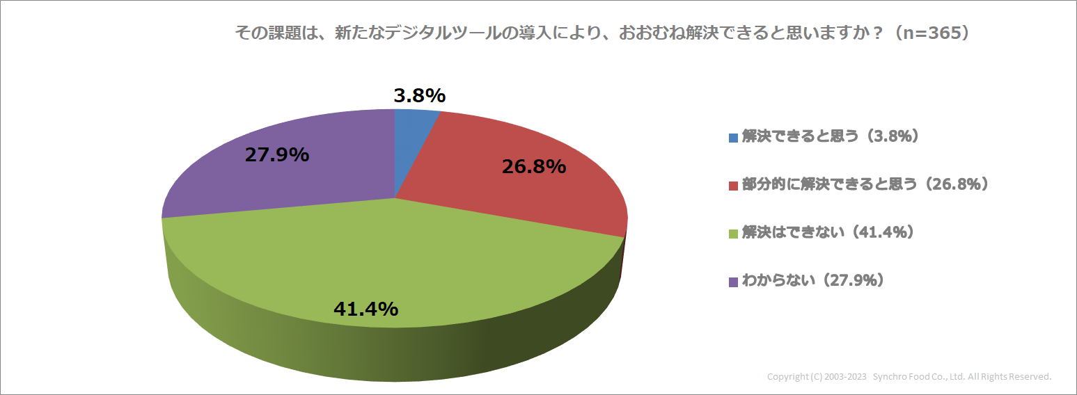 続いて、前問で選択した課題が、新たなデジタルツールを導入することで、おおむね解決できると思うか尋ねたところ、店舗ごとに意見が分かれる結果となりました。最も多かったのは「解決はできない(41.4%)」との回答で、約4割の店舗が新たにデジタルツールを導入しても課題解決には至らないと考えています。対して、「少なからず解決できると思う」(解決できると思う=3.8%、部分的に解決できると思う=26.8%)との回答も30.6%見られ、デジタルツールの導入が、飲食店の課題解決に役立つと考えている店舗も少なくありません。