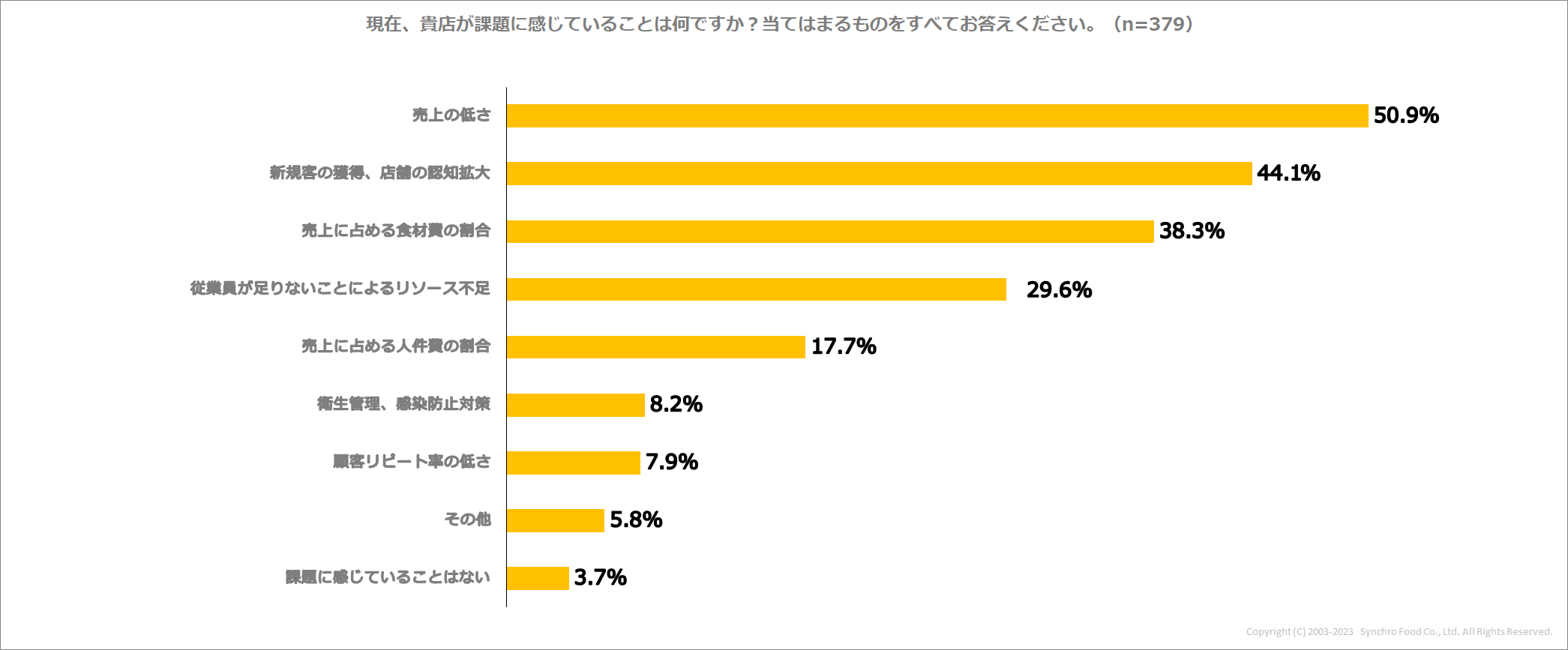 現在、飲食店が課題に感じている事柄を選んでもらったところ、約半数が「売上の低さ(50.9%)」と回答し、最多となりました。これに、「新規客の獲得、店舗の認知拡大(44.1%)」、「売上に占める食材費の割合(38.3%)」、「従業員が足りないことによるリソース不足(29.6%)」が続きます。全体を見ると、「課題に感じていることはない」との回答はわずか3.7%で、96.3%もの店舗が何らかの課題を抱えていることがわかります。さらに、約6割の店舗は、複数の課題を抱えていることも明らかとなりました。