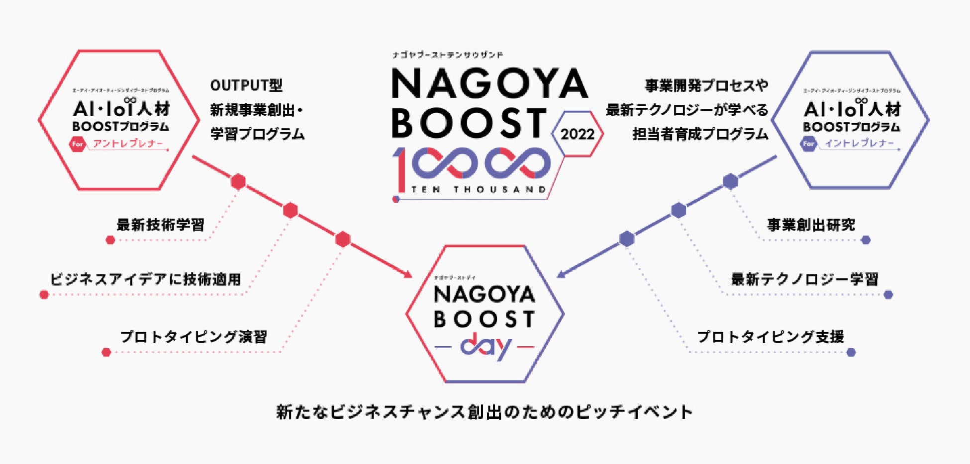 名古屋市では、当地域からのイノベーション創出と、世界の未来を切り拓くイノベーターを名古屋から10000人輩出することを目的とし、イノベーター育成・ビジネス創出プログラム「NAGOYA BOOST 10000(ナゴヤブーストテンサウザンド)」を実施しています。