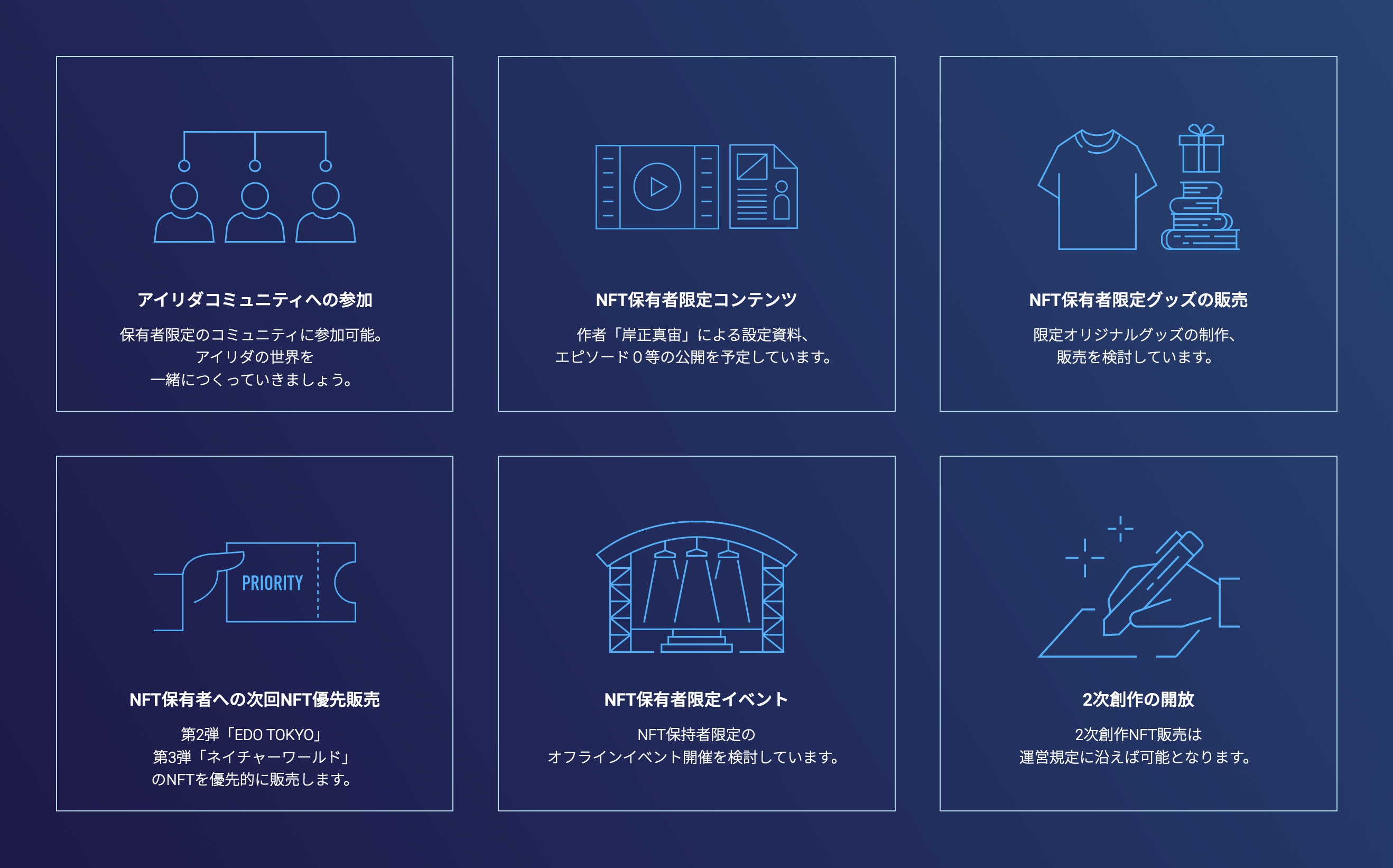 NFTをご購入いただいた保有者の皆さまは、アイリダコミュニティに参加でき、保有者様限定の特典を受けられ、様々なコミュニティ活動にご参加いただけます。