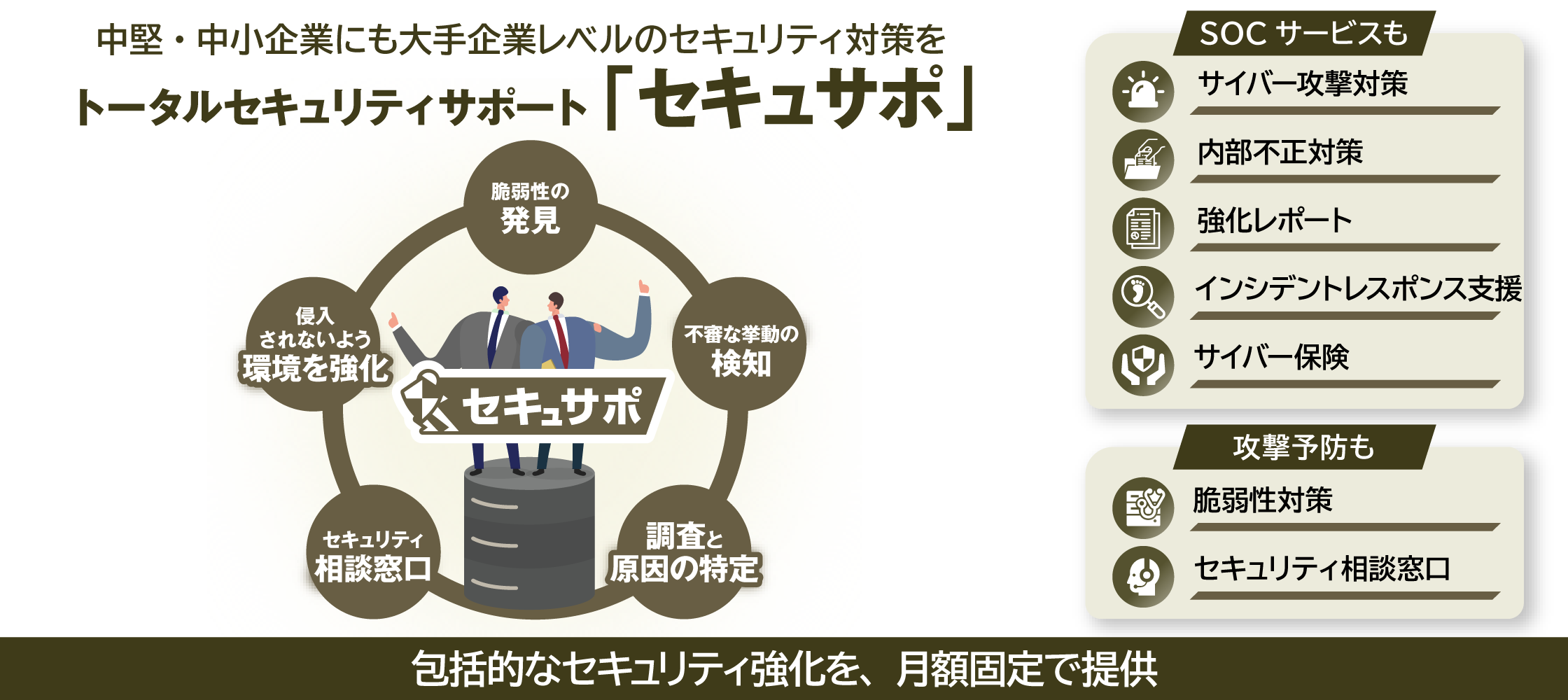 ■トータルセキュリティサポート「セキュサポ」「セキュサポ」は、中堅・中小企業のセキュリティ強化をトータル支援するクラウドセキュリティサービスです。サイバー攻撃・内部不正の監視や脆弱性診断、事件時の原因特定や影響範囲の調査、日ごろのセキュリティ相談の窓口など、サイバーセキュリティの専門チームが、貴社のセキュリティ対策に求められる包括的な対応を月額固定料金で提供します。