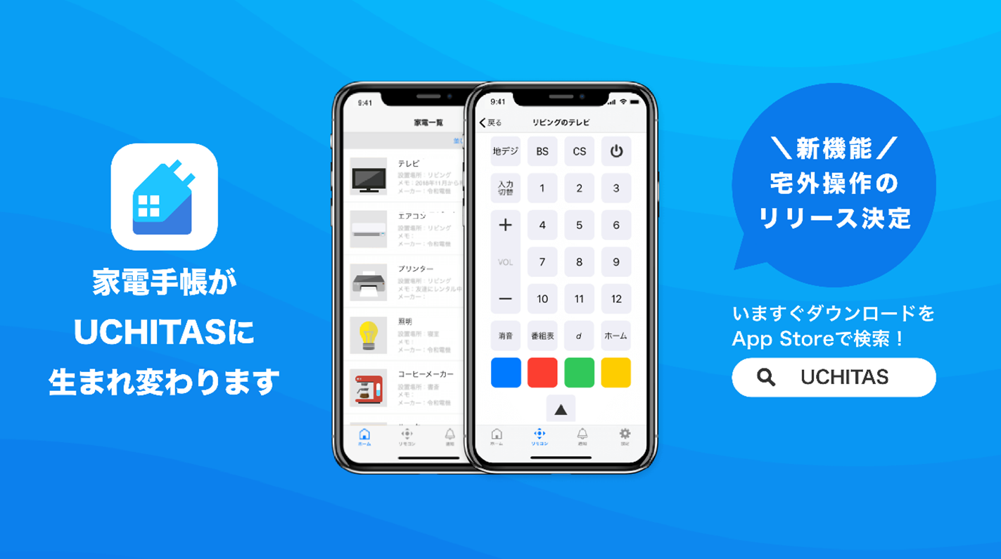 今回、家電活用アプリ「家電手帳」に、より多くのシーンでご利用いただけるよう、宅外から家電操作を行える新機能を追加し、「うち(家)をAI技術でアップデートし続け、家事にまつわるタスクを託していただける存在」でありたいという意味をこめた造語として「UCHITAS(ウチタス)」に名称変更しました。