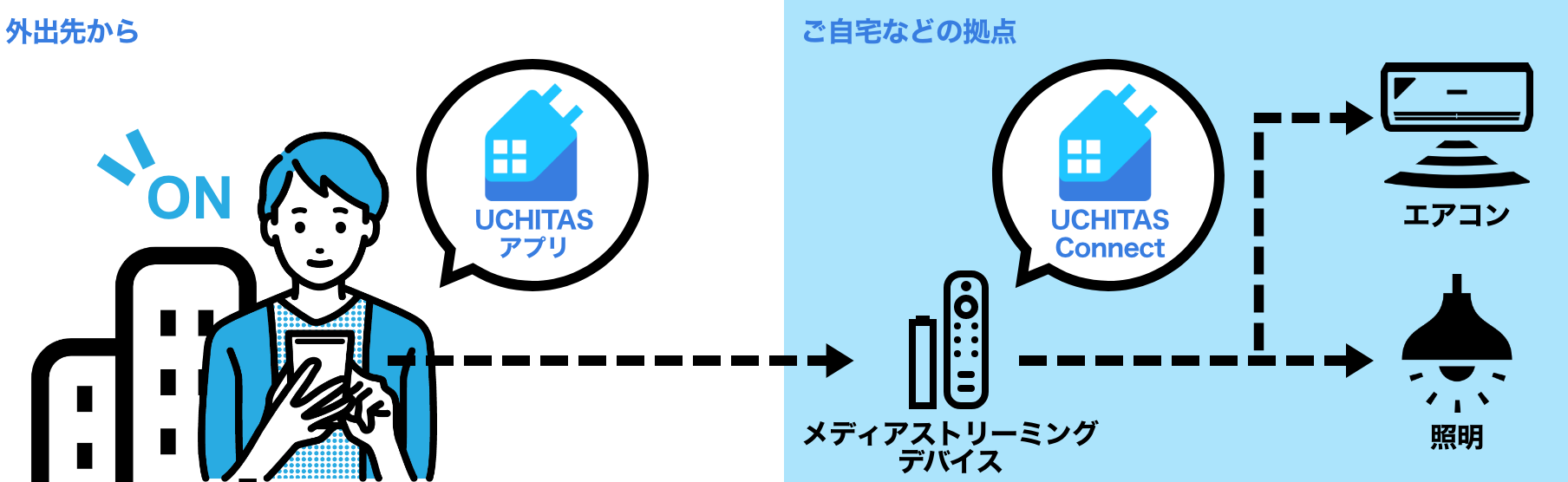 今回、外出先から利用したいというニーズを受け、「UCHITAS」に宅外から家電操作を行える新機能を追加しました。