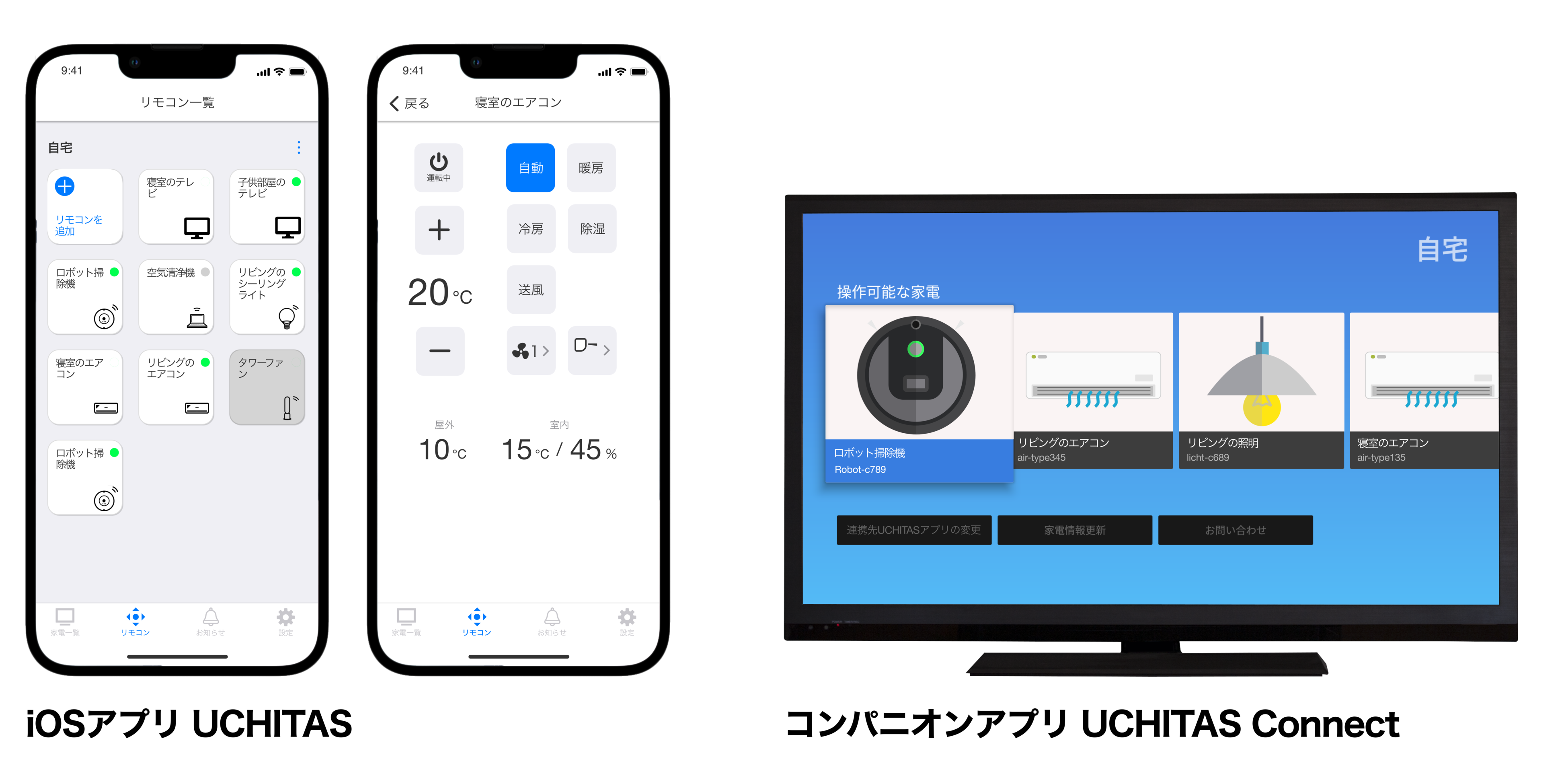 「UCHITAS」は、国際標準規格などに対応し、ネットワーク経由でスマートホーム機器とアプリ間を双方向通信します。このため、リモコン機能による操作指示の結果をアプリ側で受信し、スマートホーム機器側のセンサーが計測している室温や湿度情報などをアプリで表示することが可能です。