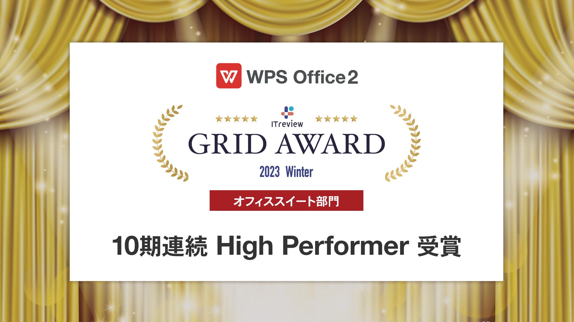 キングソフト「WPS Office」はユーザーから満足度に優れた製品であると評価され、2020年から10期連続となる「High Performer」を受賞いたしました。多くのユーザーから評価いただいたことに感謝申し上げるとともに、今後も機能を拡充し、高品質でコストパフォーマンスのよい製品の提供に努めてまいります。