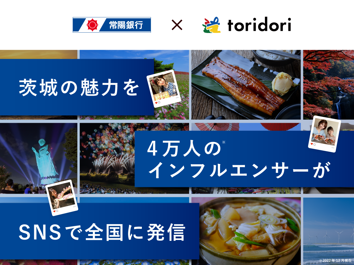本業務提携は、当社が運営するインフルエンサーマーケティングプラットフォーム『toridori marketing(トリドリマーケティング)』を、常陽銀行を利用するお客様にご提供し、茨城エリアの魅力ある商品やサービスを、インフルエンサーの発信力を活用して全国に届け、お客様の認知拡大・集客支援のサポートをすることが目的の「SNSを活用した地方DX※プロジェクト」です。