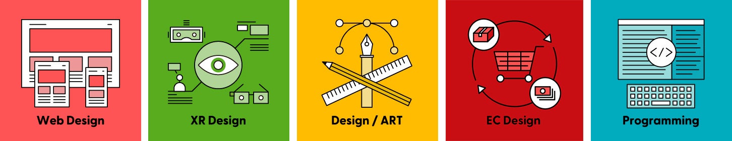 「WEB系分野」「XR系分野」「Design/ART」「EC系分野」「プログラミング分野」で、未経験の方から経験者の学び直し、そして制作会社等のプロの方々も学んでいただけるプロゼミ・特別講義なども設置。目的別に合わせたコース・講座の選択が可能です。