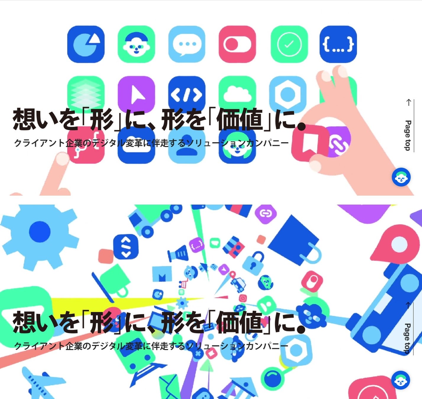 動画のクリエイティブやサイト全体のデザイントーンはポップなイラストを用いて、デジタルプロダクト開発によって広がる未来への期待・それにワクワクできるような表現を目指しています。