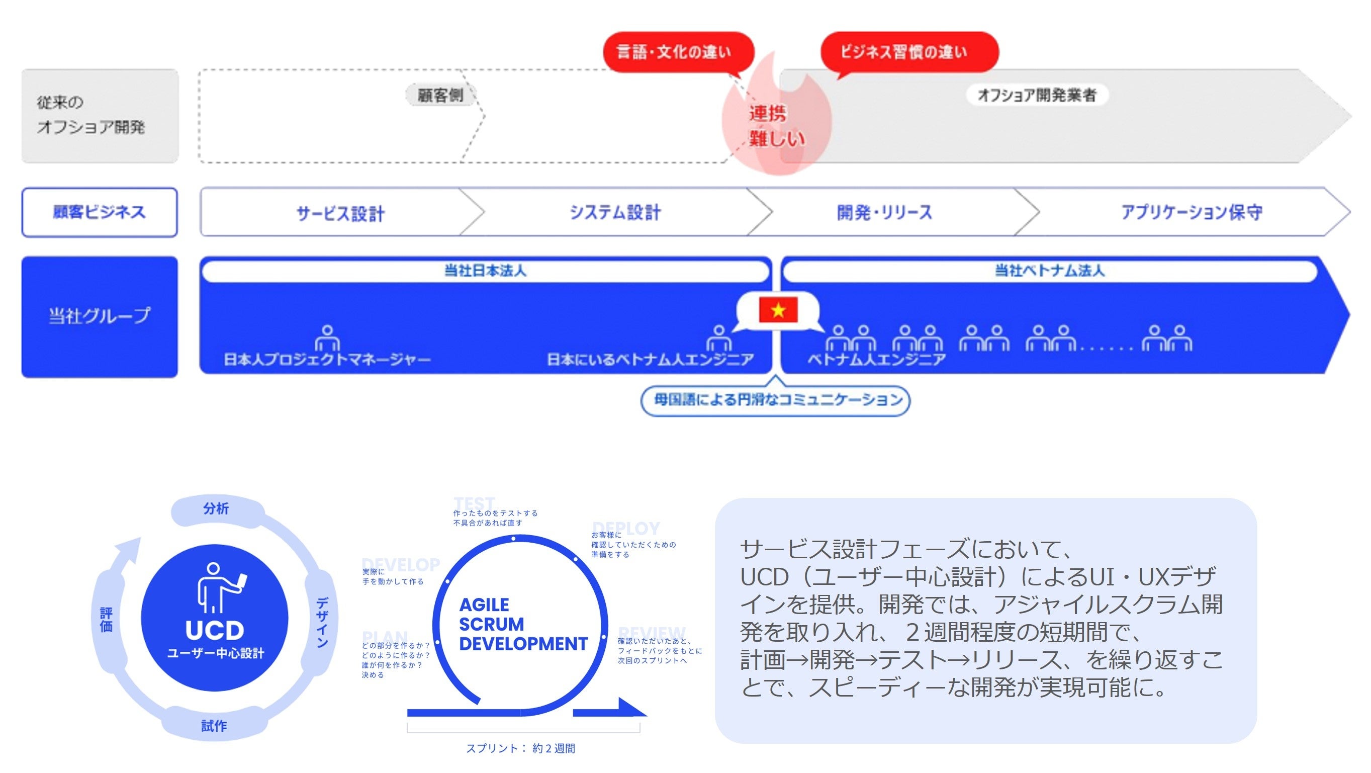 当社の提供するサービスは、日本とベトナムのリソースを融合させ、顧客のビジネスとテクノロジーという両側面からDXを推進する「ハイブリッド型サービス」です。ハイブリッド開発においては、コミュニケ―ションの仲立ち役である、日本人PMとベトナム人PMの豊富な経験から、従来のオフショアでありがちなコミュニケーションの齟齬などを防ぎます。実際のサービス設計フェーズにおいては、UCD(実際にサービスを利用するユーザーの使い方を元にデザイン・インターフェイスを作成)によるUI・UXデザインを提供し、実装のフェーズではアジャイルスクラム開発を取り入れ、計画、開発、テスト、リリースを繰り返すことにより、高品質かつスピーディな開発を実現します。このように、サービス設計からエンハンスまでワンストップでサービスを提供することで、クライアントへ貢献いたします。