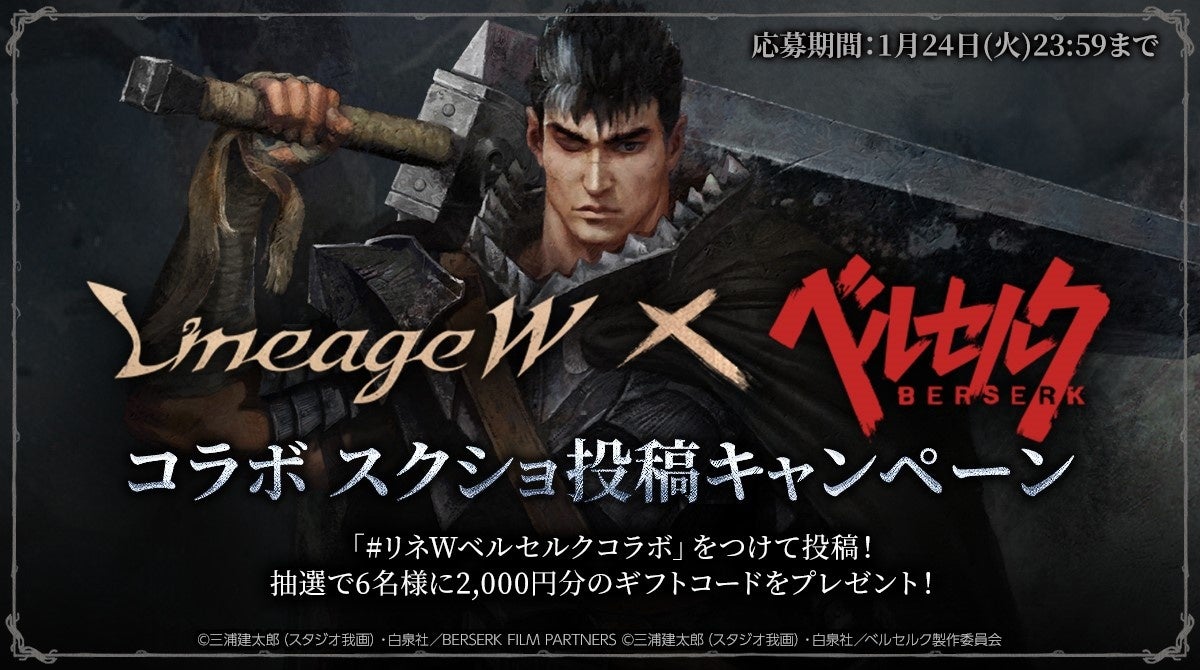 キャンペーン期間中、「リネージュW×ベルセルク」コラボにまつわるキャラスキンの獲得や、ゲームプレイ画像などをスクリーンショットし、ハッシュタグ「#リネWベルセルクコラボ」をつけてTwitterに投稿してください。