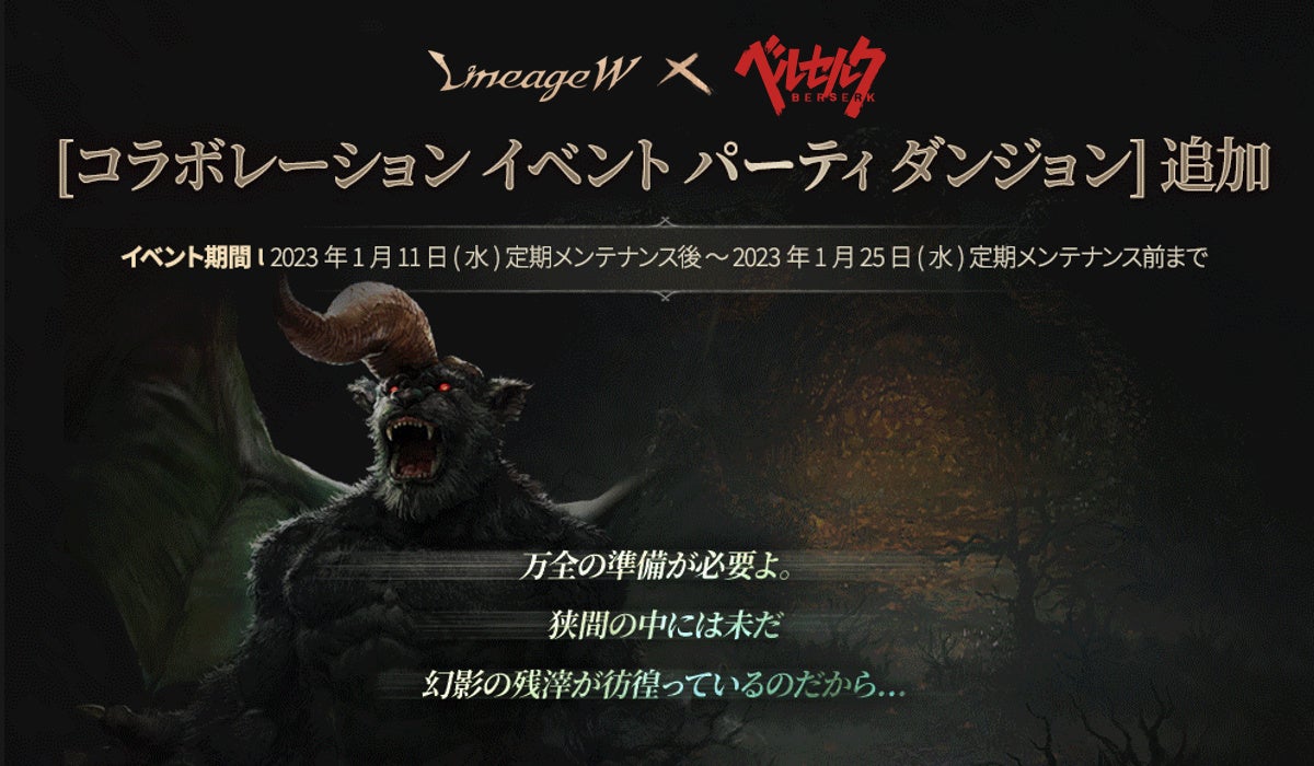 『リネージュW』「ベルセルク 2nd コラボレーション」2週目!コラボレーション イベント パーティ ダンジョン「次元の狭間」開催中!