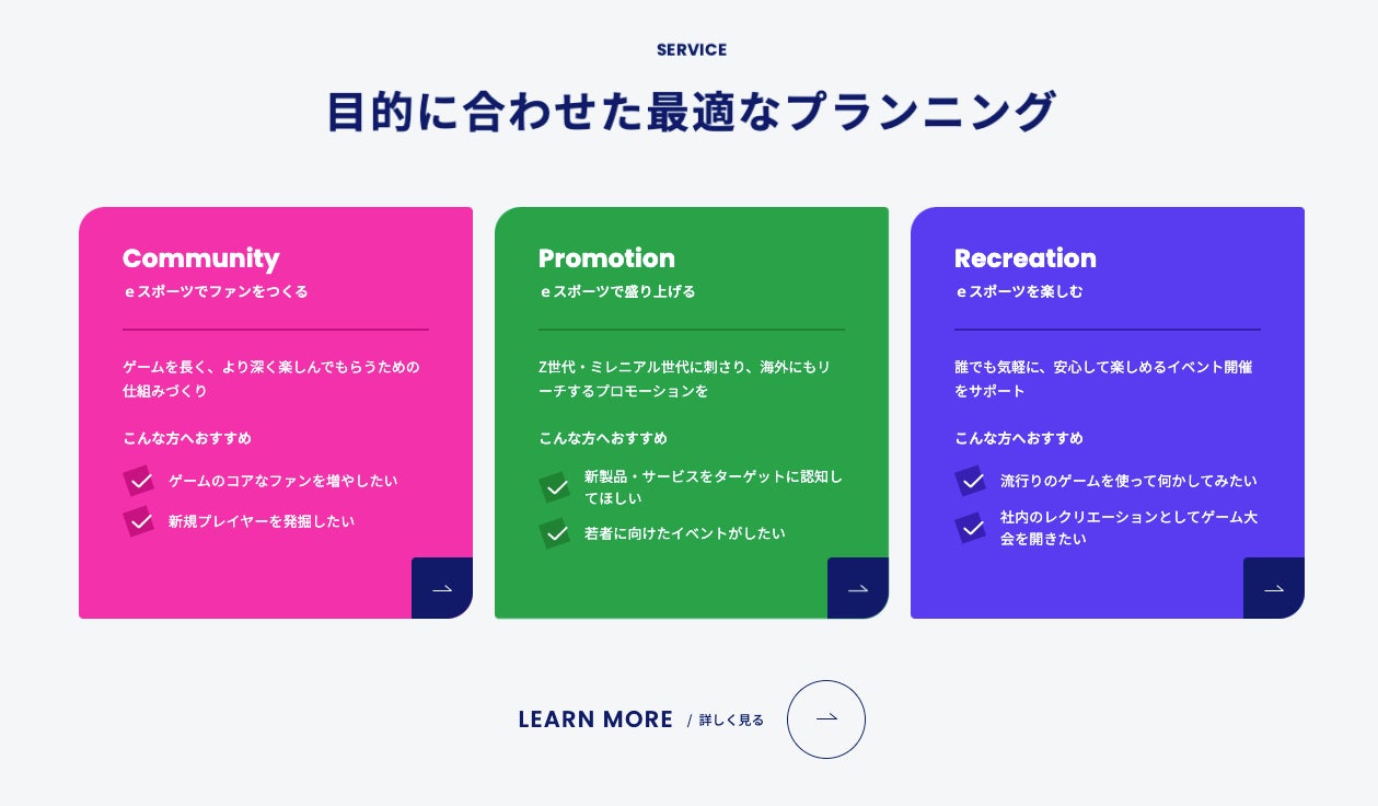eスポーツを通じてゲームタイトルのプレイヤー増加・定着を図りたい企業様、eスポーツを自社ブランドや商品のプロモーションに活用したい企業様、eスポーツを通じて企業・団体・地域のコミュニケーション活性化を図りたい企業・団体様、それぞれのニーズに合わせた私たちJCG独自のアプローチをご紹介しています。