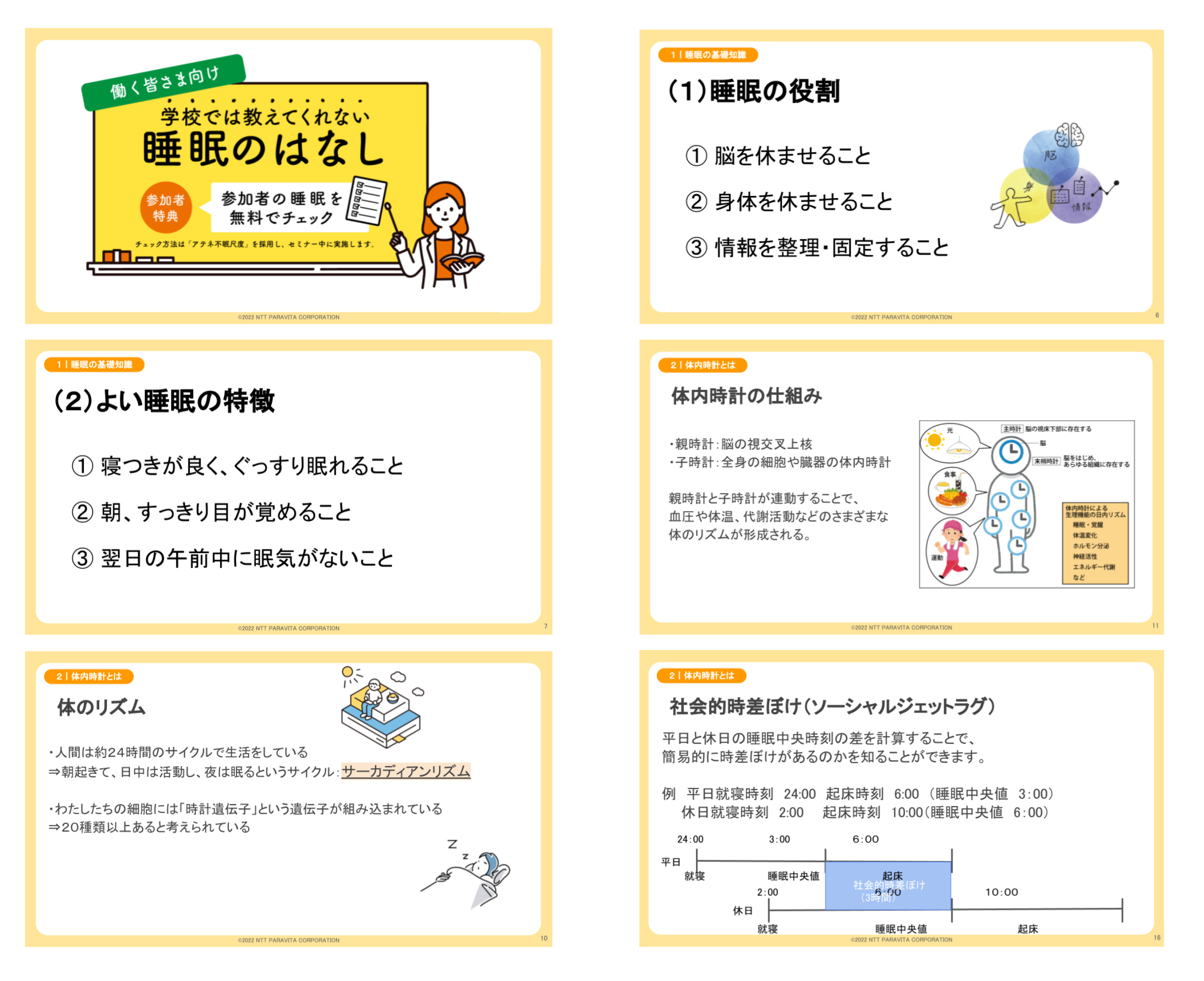 当日セミナーでは、NTT PARAVITA所属のねむりのパーソナルトレーナーが、睡眠に関する基礎知識からその日から実践できるより良い睡眠を実現できるテクニックまで、以下のようなスライドを用いながらわかりやすくお伝えいたします。 また、自分の睡眠の現状を知ることができるアンケートも実施。参加者ひとりひとりが睡眠改善を通して、日々の業務のパフォーマンスアップにつなげていただけるようサポートします。