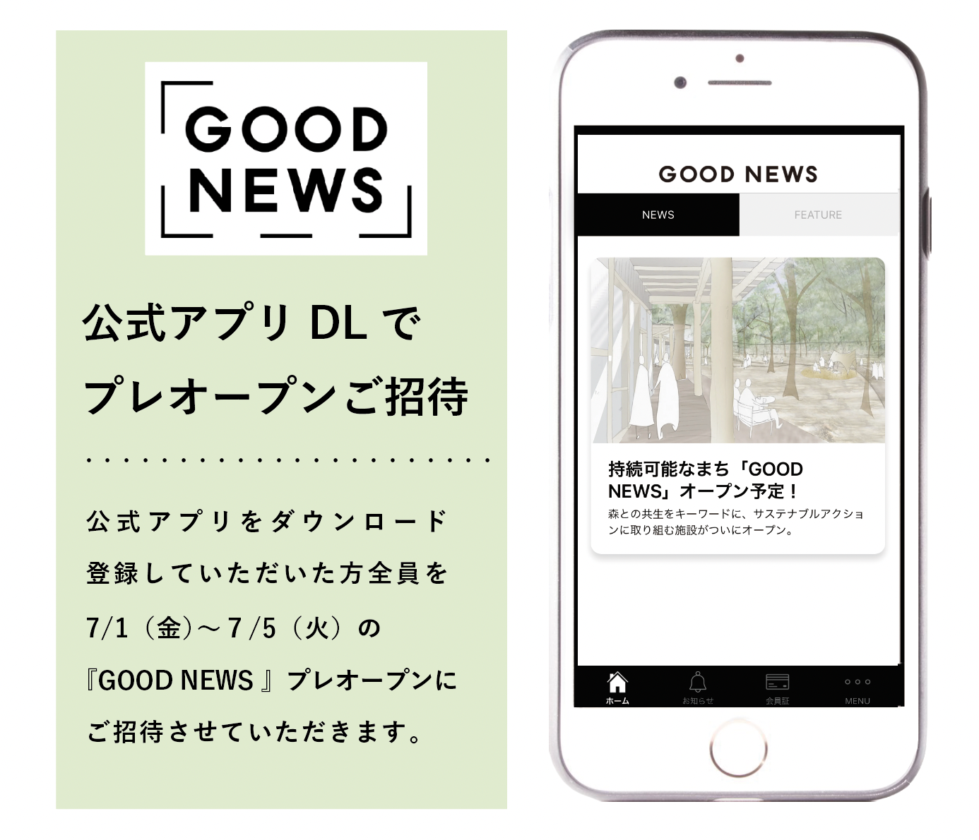 アプリでの会員登録で、店頭でのお買い物毎にサステナブルポイントが貯まります。貯まったポイントは、GOOD NEWSの 取り組むサステナブルアクションに運用させていただくことで、ご来場の皆様の日々のお買い物を「持続可能なまちづくり」に繋げていきたいと考えています。また、通常 500円かかる GOODNEWS施設の駐車場が無料になる特典もご用意。アプリ会員登録して頂いた方限定で、2022年 7月 1日(金)〜7月5日(火)の GOOD NEWS施設プレオープンにも 特別にご招待させていただきます。