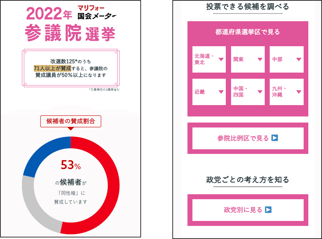 「マリフォー国会メーター」は、世の中と国会の間に存在するギャップを、社会に対して可視化するために生まれました。20年の間実施されている「東京大学谷口研究室・朝日新聞社共同調査」の回答を元に、どの政治家が同性婚に賛成/反対しているかをデータで表示、インターネット上で簡単に調べることができるアプリ型のウェブサイトです。さらに、国会議員に対して直接応援や陳情などの呼びかけができるように、各議員や候補者の連絡先やメッセージ例などを公開。どの政党・議員を選ぶかの判断や投票促進の他、政治への参加に繋がります。