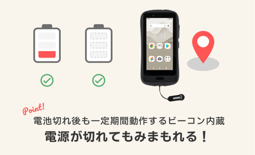 ・保護者の不安である「電池切れ問題」にも対応otta見守りサービスで築いてきた位置情報プラットフォームを搭載することにより、次世代キッズスマホ「Hamic MIELS」は、多くのGPS端末やキッズスマホの共通課題であった電池切れの問題にも対応しました。本体端末の電池が切れてしまった場合も、一定期間、微弱電波を発信し続けるため、集まった接触情報や通過情報をもとに端末の位置情報を割り出すことができます。