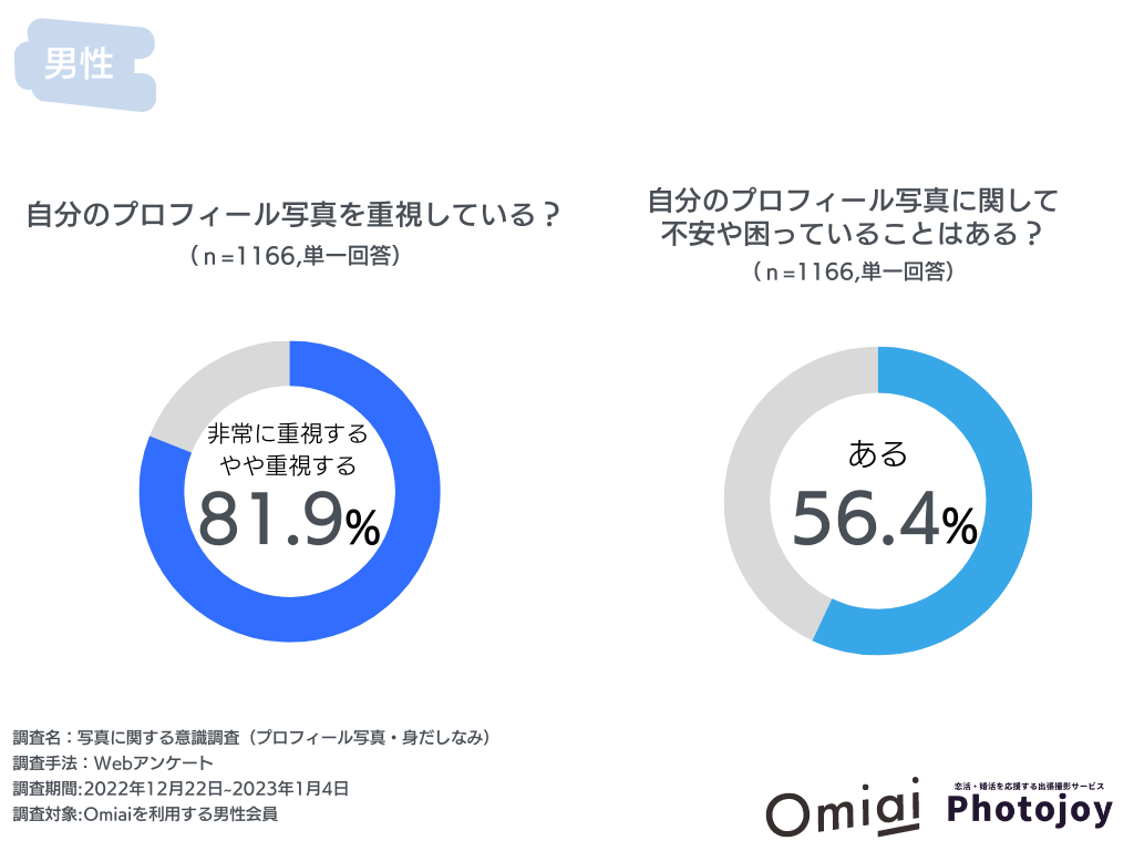男性会員のうち、81.9%が「プロフィール写真の重要性を意識している」ものの、77.4%が「相手に好印象を与える写真が分からない」、57.0%が「自分がしっかり映った写真を持っていない」と、対応方法が分からず、結果として、男性の半数以上の56.4%が「プロフィール写真に不安を持っている」ことが判明しました。