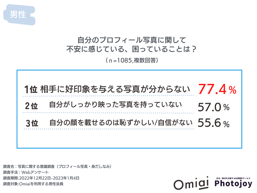 当社調べによると、女性の94.1%が「相手のプロフィール写真」、70.6%が「見た目・ルックス」を重視すると回答。一方、男性は81.9%が「プロフィール写真の重要性を意識している」ものの、77.4%が「相手に好印象を与える写真が分からない」、57.0%が「自分がしっかり映った写真を持っていない」、と対応方法が分からなく、結果として、男性の半数以上の56.4%が「プロフィール写真に不安を持っている」ことが判明しました。