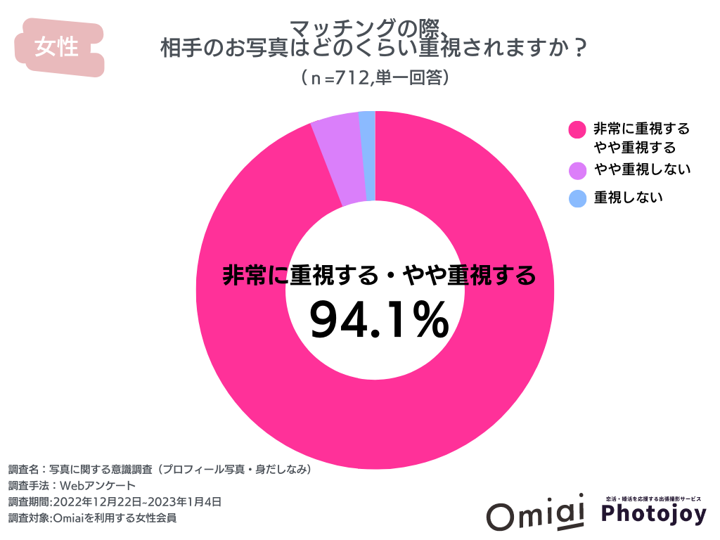 マッチングアプリ「Omiai」を運営する株式会社ネットマーケティング(本社:東京都港区、代表取締役社長:靱江佑介、以下、当社)は、昨今、出会いの選択肢として一般化しつつあるマッチングアプリに関する意識調査を実施しました。本調査から、女性が男性とマッチングする際に、最初に重視するのは、「プロフィール写真94.1%」、「見た目・ルックス70.6%」、また男性の過半数はプロフィール写真に不安を感じていることが判明しました。