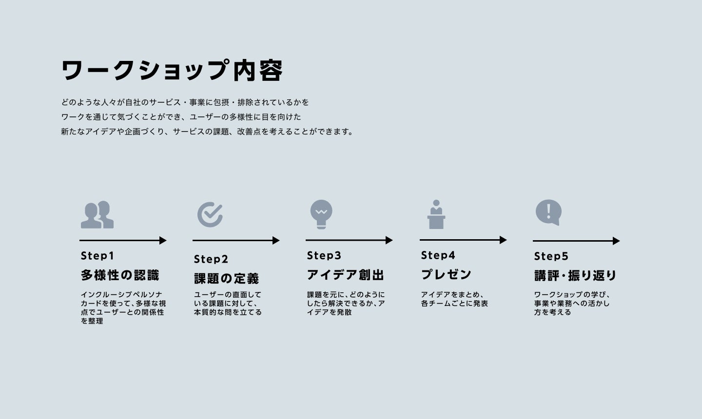 この度、業界をリードするデザイナー、エンジニアとソーシャルセクターのつながりから新たに、D&Iを推進する企業の支援を後押しするため、企画から事業化の支援までを体験できる、『デザインワークショップ』の提供を開始しました。