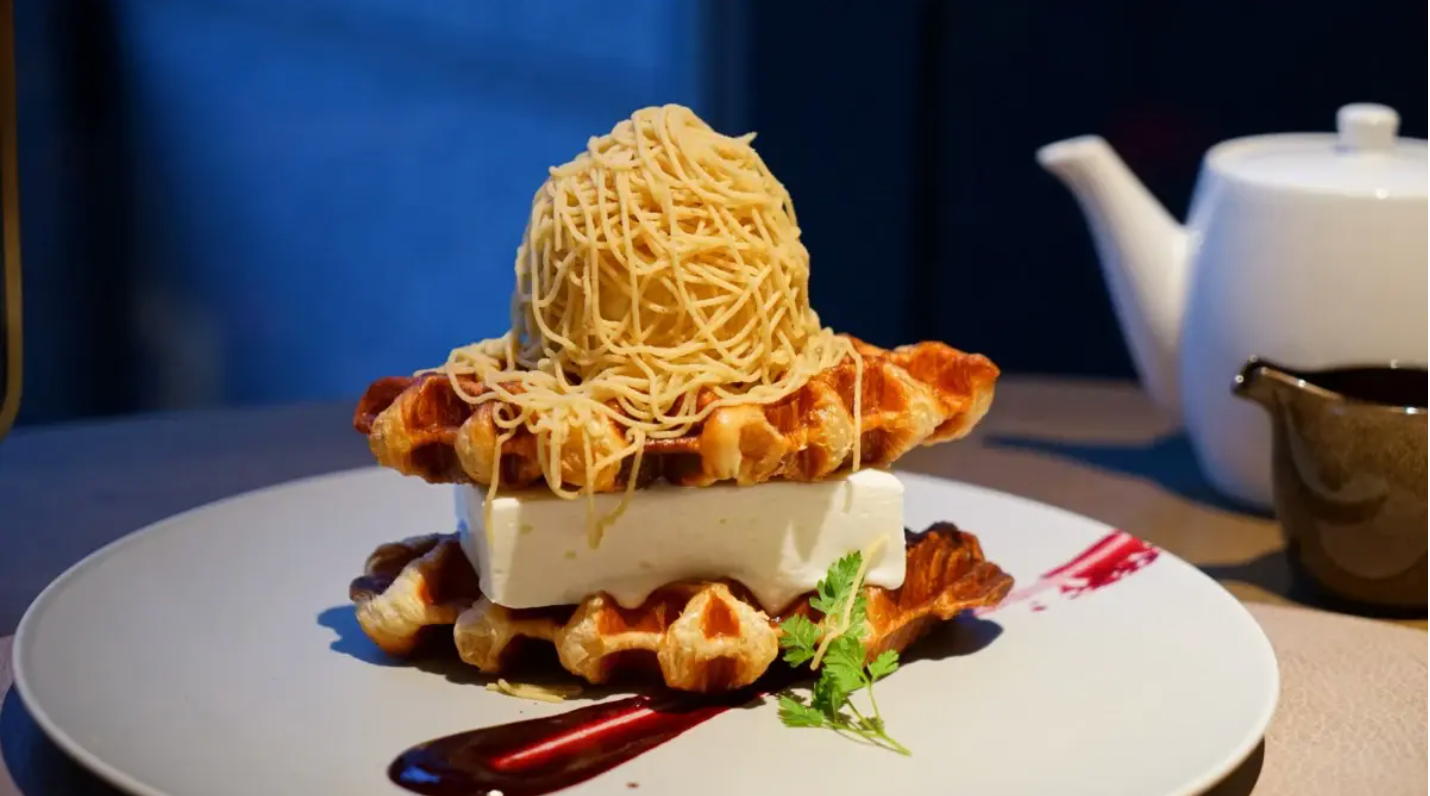 東京・表参道の「ザ ストリングス 表参道」では、いち早く2022年10月頃から“目の前で仕上げる”タイプの期間限定スイーツ「クロッフルのレアチーズケーキサンド モンブラン仕立て」を提供。