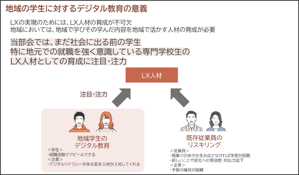 LX人材育成部会は、日本経済の活性化にはテクノロジーを活用した生産性向上が必要不可欠だと広く認識されている一方で、活用したいデジテクノロジーがあっても、それを活用できる人材が不足しており、それが企業におけるデジタル化の大きな阻害要因の一つになっているという事実を捉えております。その課題を解決するために企業現場のデジタルリテラシーの底上げによるテクノロジー活用の土台作りが必要と考え、テクノロジーを事業に取り込み活用できる人材の育成を進めています。